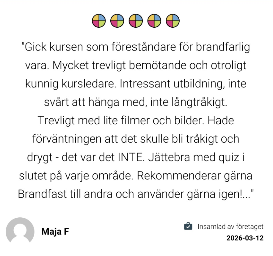 Välkommen att boka dina kursplats på någon av våra öppna kurstillfällen för föreståndare brandfarlig vara. Kursen som går på distans, leds av brandexperten Henrik Wahlström som har stor kompetens inom brandskydd och hantering av brandfarliga och explosiva varor.