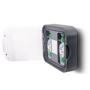 Vid en incident kan det vara bra att ha reservflaskor i närheten. På så sätt kan sköljningen fortsätta utan avbrott, även på väg till vård om det behövs. En skylt medföljer som placeras ovanför skåpet, vilket tydligt visar stationens läge för alla – barn, medlemmar, besökare eller familj.