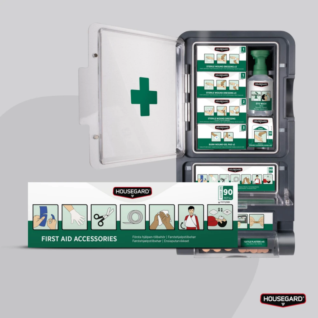Tillbehörsboxen är utformad som refill för första hjälpen stationer och innehåller sax, självhäftande tejp, mitella, rengöringsservett, självhäftande fingerförband, mun-mot-mun-skydd samt engångshandskar. Tillbehörsboxen är kompatibla med Housegard första hjälpen stationer samt andra fabrikat.